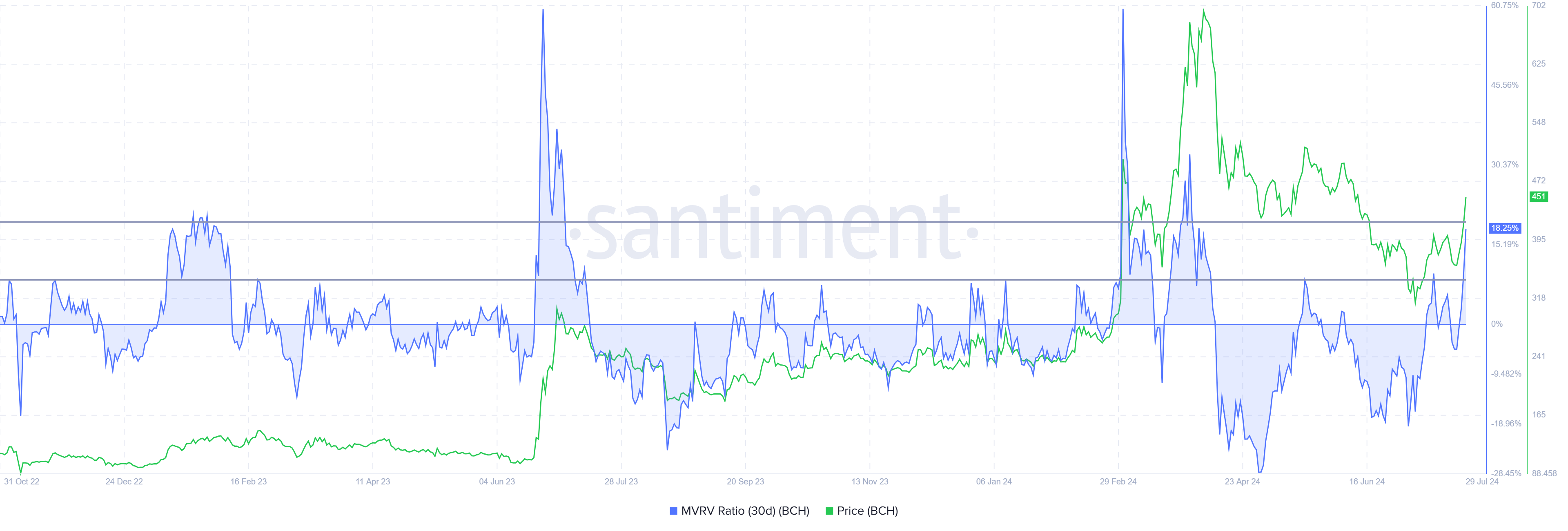 نسبة القيمة السوقية إلى القيمة المحققة (MVRV) تدعم هذه النظرية. تقيم نسبة MVRV ربح وخسارة المستثمر. حالياً، تقف نسبة MVRV لمدة 30 يوماً لبيتكوين كاش عند 18%، مما يشير إلى الربحية وضغط البيع المحتمل.