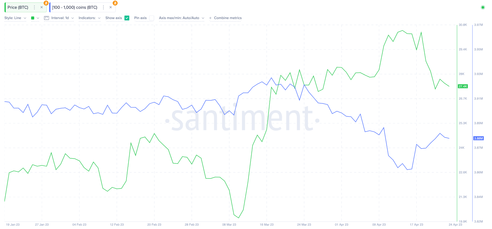 ويوضح الرسم البياني أدناه إلى أضافتهم نحو 20000 بيتكوين إلى أرصدة المحافظ بين 16 و 24 أبريل.