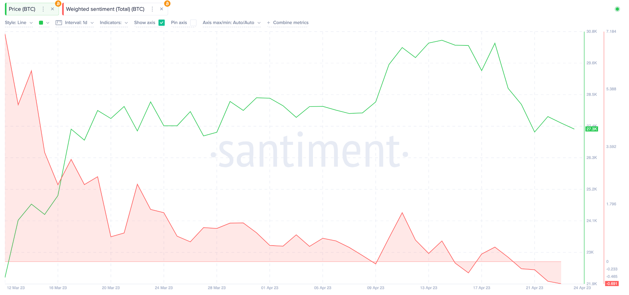 ووفقاً للرسم البياني أدناه، ثمة تحول للعملة الرقمية إلى السلبية بعد انخفاضها من 1.53 إلى -0.70 في الفترة بين 11 و 24 أبريل.
