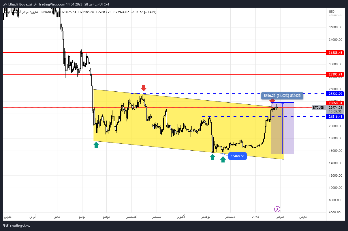 فنيا، سعر البيتكوين يتداول منذ عدة أيام حول مستوى المقاومة المهم 23000 دولار دون أن يتمكنن من اختراقه، رغم ارتفاعه بنسبة 50٪ تقريبا من أدنى مستوياته التي سجّلها في 21 نوفمبر مباشرة بعد انهيار بورصة FTX عند مستوى 15469 دولار.
