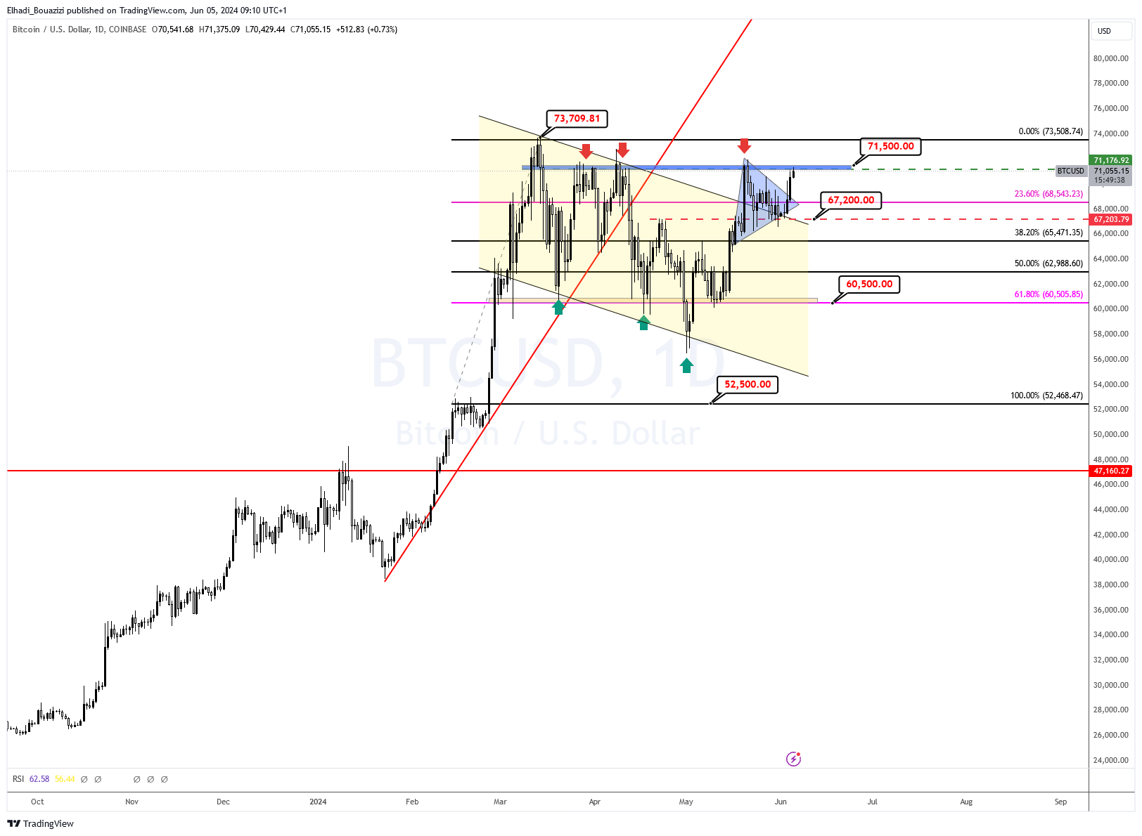 فنيا، تمكن سعر بيتكوين BTC من كسر الحد العلوي للمثلث المتماثل، ليرتفع بحدة كما هو متوقع في هذه الحالة. حاليا يختبر مستوى المقاومة المحصور بين 71,200 دولار- 71,5000 دولار.
