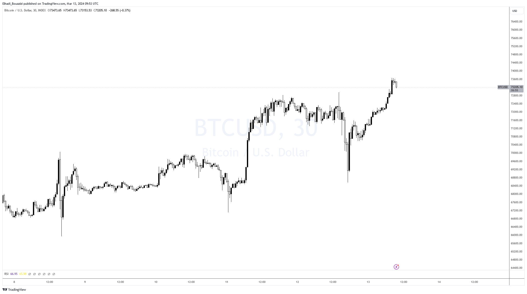 شهدت سوق العملات الرقمية أمس، الثلاثاء 12 مارس، تقلبات حادة في سعر بيتكوين، حيث تجاوزت العملة حاجز 73 ألف دولار في البداية، قبل أن تشهد تصفية هائلة للمراكز العقود الآجلة بقيمة تتجاوز 361 مليون دولار، وهو ما أدى إلى انخفاض حاد في سعر العملة لأقل من 68,300 دولار.