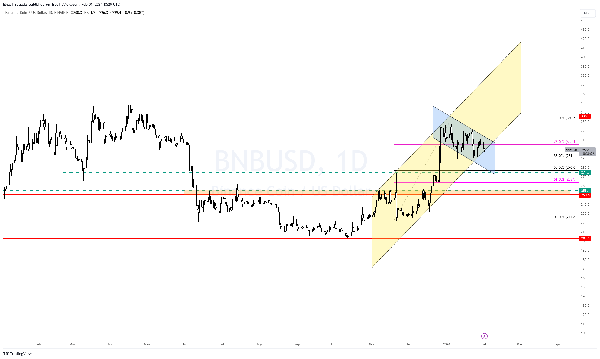 لتأكيد الاتجاه التصاعدي، يجب أن يغلق الشمعة اليومية لسعر عملة BNB فوق 340 دولار وأعلى مستويات ديسمبر 2023، ويُفضل أن يكون ذلك مع ارتفاع في حجم التداول.