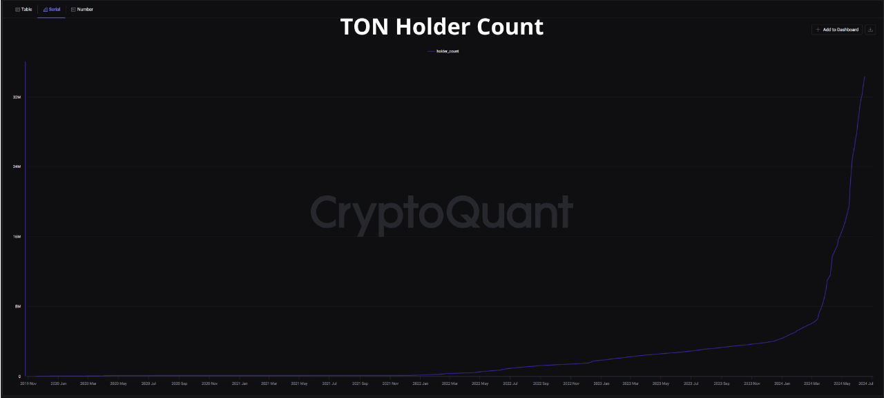 تظهر تحليلات مارتن وجود 32 مليون حامل لـ Toncoin، ارتفاعًا من 2,9 مليون قبل عام. يمثل هذا زيادة بنسبة 1003% خلال عام ويشير إلى الشعبية المتزايدة لعملة TON.