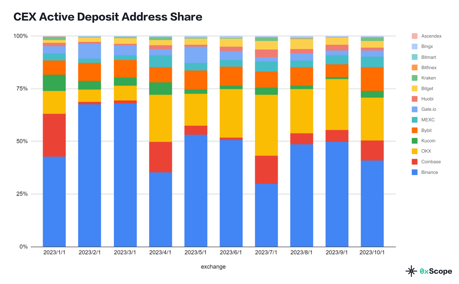 وفقًا لتقرير صادر عن شركة تحليل بلوكتشين 0xScope، فقد فقدت بينانس، أكبر بورصة عملات مشفرة، حوالي 10٪ من حصة السوق أمام منافسيها مثل OKX و Upbit و Bitget و MEXC. كما سيتعين على بورصات العملات المشفرة الركزية مضاعفة جهودها لتحقيق أداء جيد.