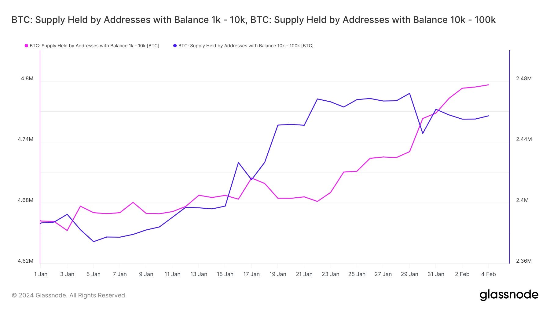 العناوين التي تحتفظ بين 10,000 و100,000 BTC شهدت أكبر زيادة في الرصيد، بنسبة 2.97% منذ بداية العام (YTD). بينما تلك التي تحتفظ برصيد بين 1,000 و10,000 BTC شهدت زيادة في رصيدها بنسبة 2.89% YTD.