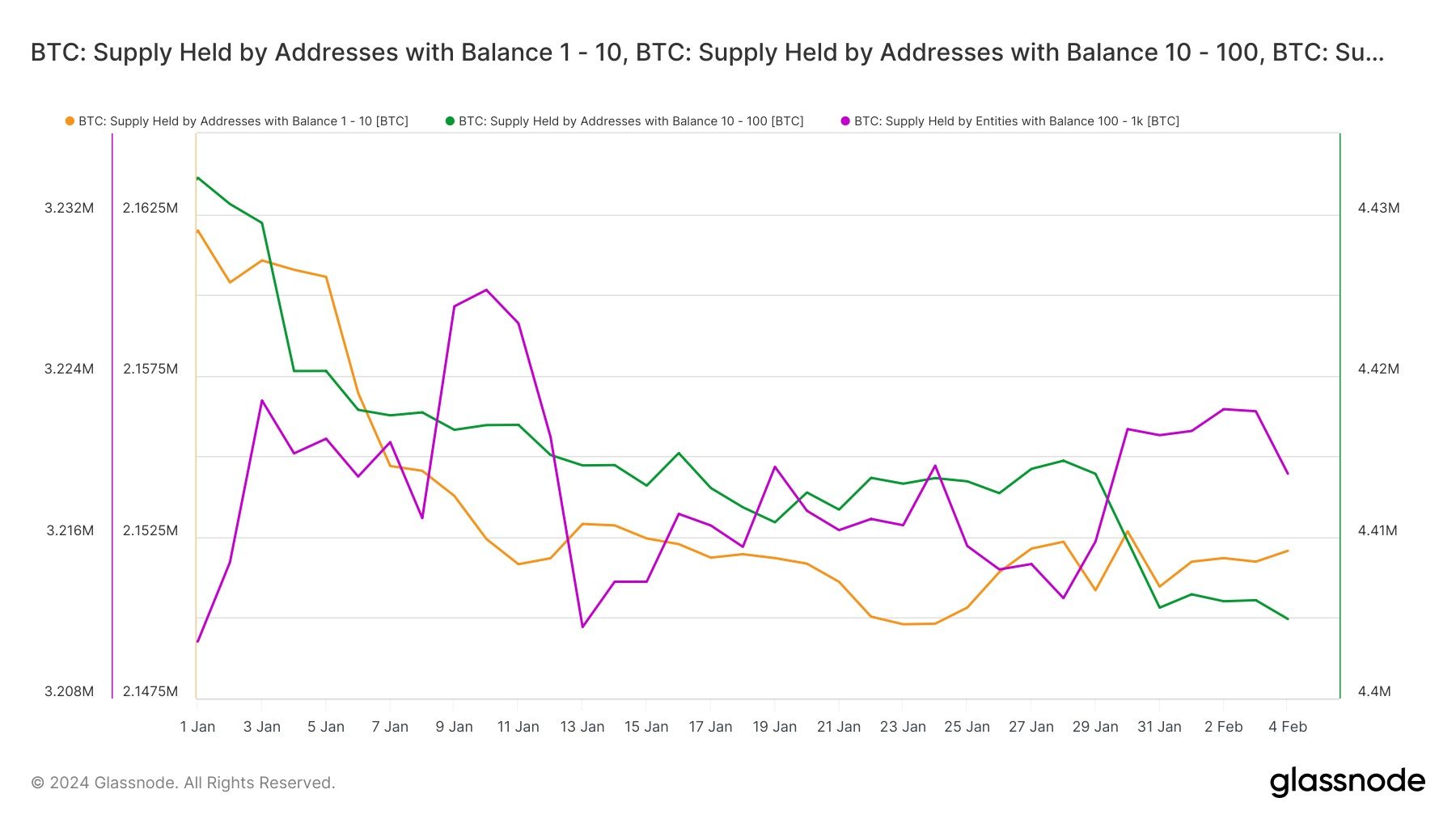 وقد يشير الانخفاض في الحيازات بين العناوين ذات الأرصدة بين 100 و1,000 BTC إلى تحرك نحو التنويع واستراتيجيات إدارة المخاطر. ربما تأثر بتوافر التعرض للبيتكوين من خلال صناديق ETFs.