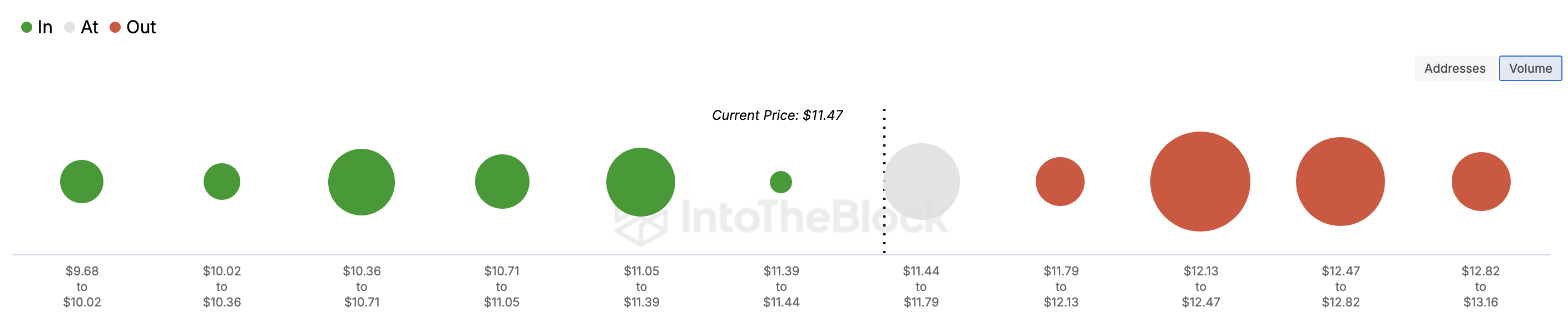 بالإضافة إلى ذلك، يظهر مؤشر In/Out of Money Around Price (IOMAP) أن قد يستمر LINK في مواجهة المقاومة على الرغم من عدة محاولات لتجاوز 12$. يظهر IOMAP عدد العناوين والحجم الذي يحتفظ برمز في أرباح أو خسائر غير محققة.