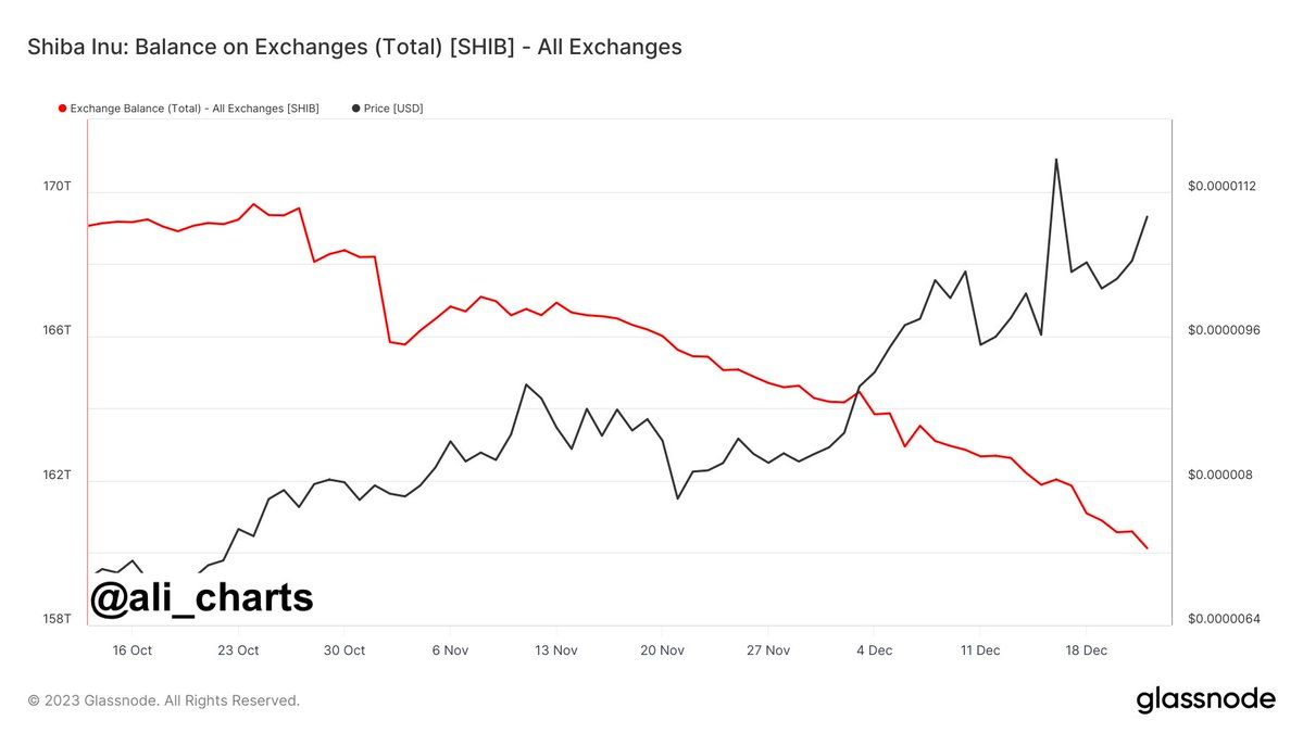 أشار المحلل علي (@ali_charts) في تغريدة على منصة X، أن كميات كبيرة من عملة شيبا إينو (Shiba Inu) قد سُحبت من بورصات العملات الرقمية منذ نوفمبر.