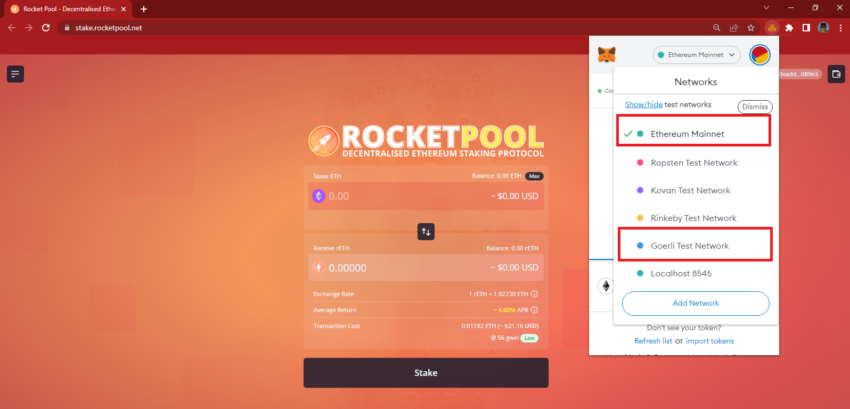 باستخدام القائمة المنسدلة من اتصال ميتاماسك حدد الشبكة الصحيحة وتحديد إيثيريوم ميننت و شبكة جورلي تيست.