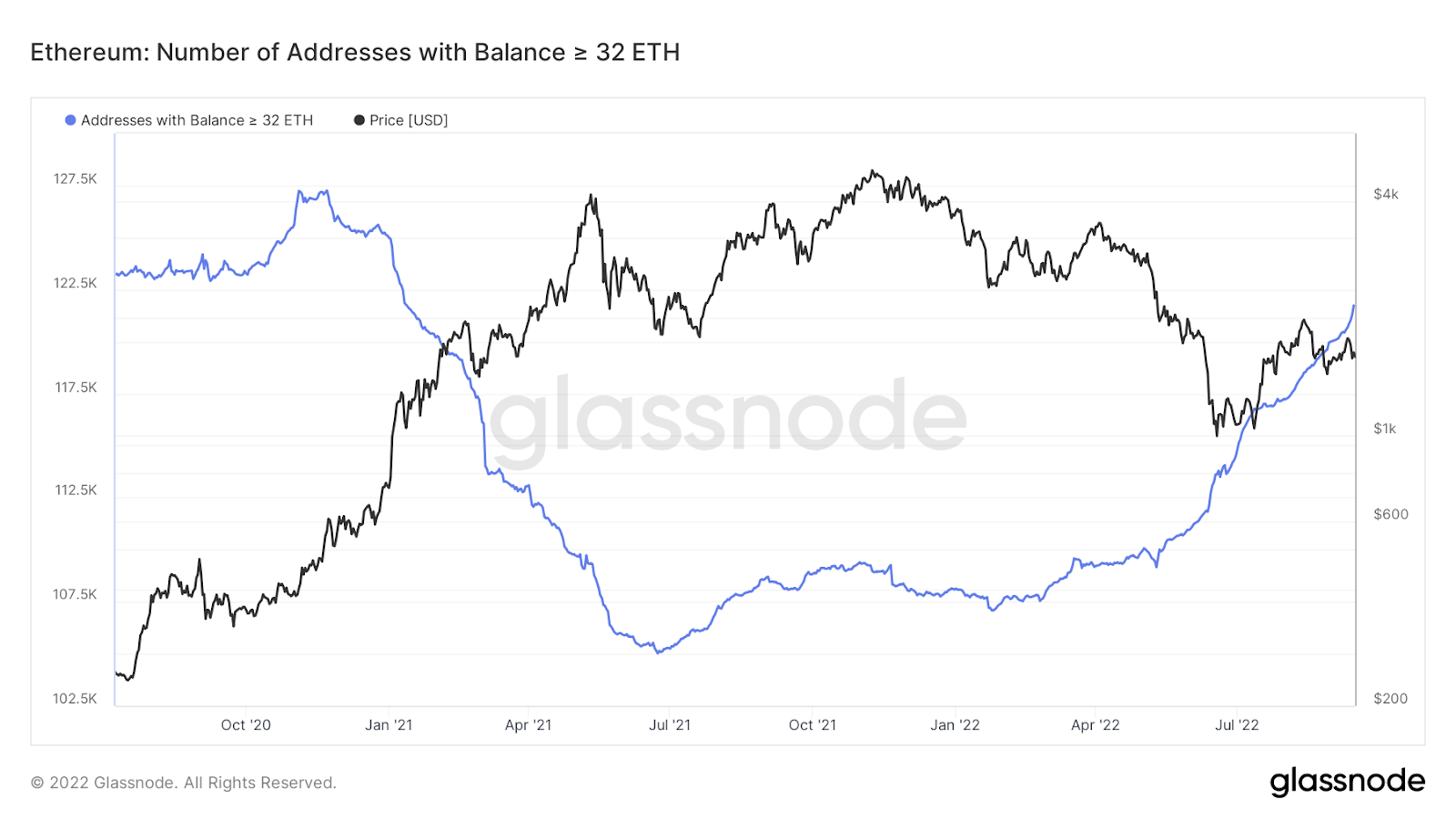 وثمة فترة سابقة شاهدت هذه الزيادات من قبل وهي نوفمبر 2020 بعد مطالبات برهان الإيثر حيث الوصول إلى 127.255 عنوان استوفى الحد الأدنى من المتطلبات البالغة 32 إيثر ليقف اليوم عند 121.732 فلم يظهر هذا التطور للمدققين في شبكة إيثيريوم الجديدة بل وضح في التراكم التدريجي والذي يؤثر على المدى الطويل على سعر الإيثر.