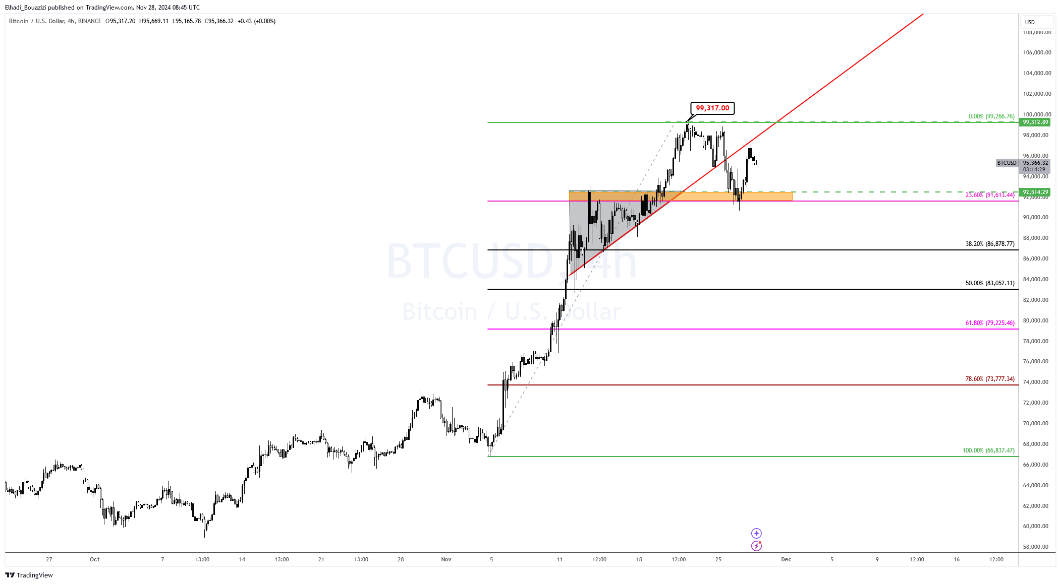 شهد سعر بيتكوين BTC انخفاض بنسبة 9% من أعلى مستوى لها على الإطلاق البالغ 99,800 دولار. لكن الاتجاه الصاعد طويل الأجل لا يزال قائمًا. وعلى الرغم من هذا التصحيح الملحوظ، لم يتراجع التفاؤل بين المستثمرين، حيث يترقب الكثيرون فرصة الشراء من الانخفاض ودفع السعر إلى تجاوز مستوى 100,000 دولار.