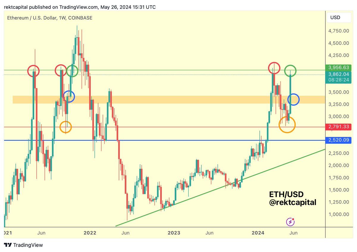 شركة تحليل العملات الرقمية، Rekt Capital، ترى أن سعر إثيريوم (ETH) يجب أن يشهد إغلاق أسبوعي فوق 3956 دولار للارتفاع فوق نطاق 4000 دولار. وسيؤكد أن المضاربين على الارتفاع قد استعادوا الزخم.