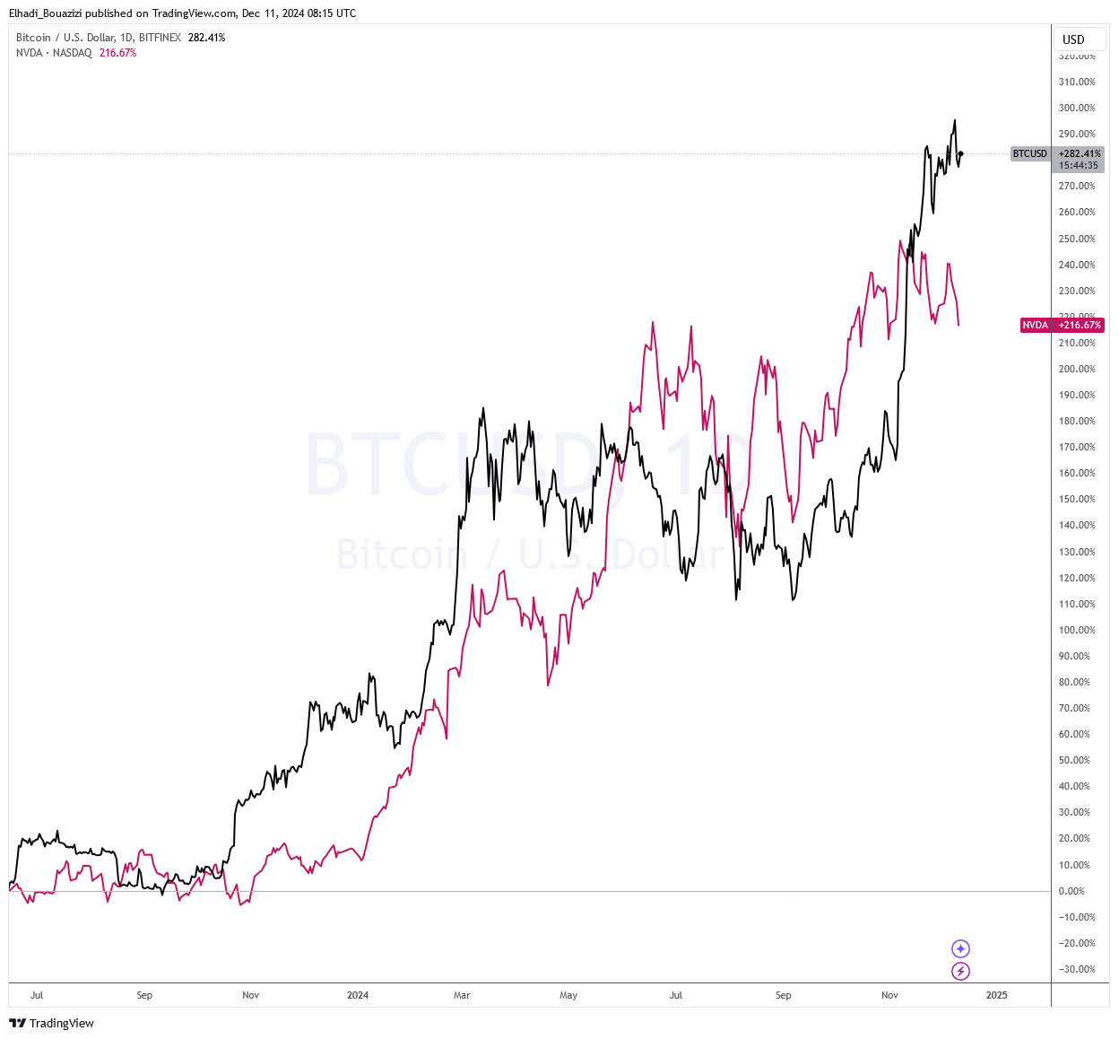 الرسم البياني اليومي لسعر البيتكوين مقارنة بسعر سهم انفيديا - المصدر: TradingView