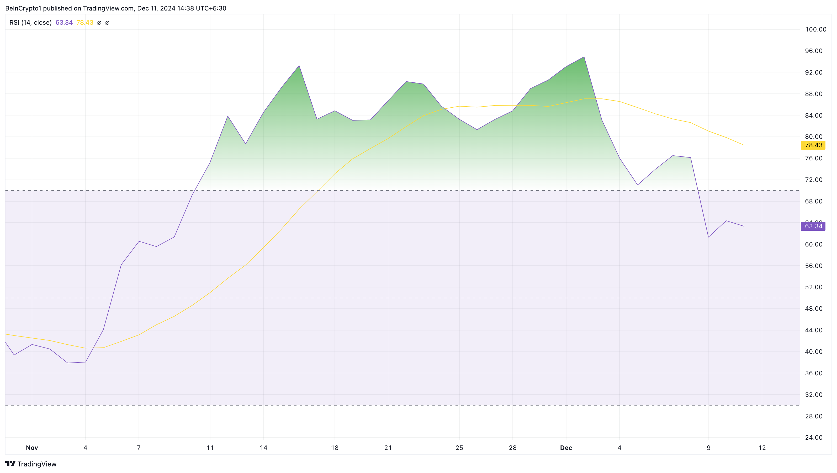 مؤشر القوة النسبية (RSI)، الذي يقيس الزخم، هو أحد المؤشرات التي تشير إلى أن سعر XRP قد ينخفض. يظهر مؤشر القوة النسبية أيضًا ما إذا كان الأصل قد تم شراؤه بشكل مفرط أو بيعه بشكل مفرط. عندما تكون القراءة فوق 70,00، يكون قد تم شراؤه بشكل مفرط، وعندما تكون أقل من 30,00، يكون قد تم بيعه بشكل مفرط.