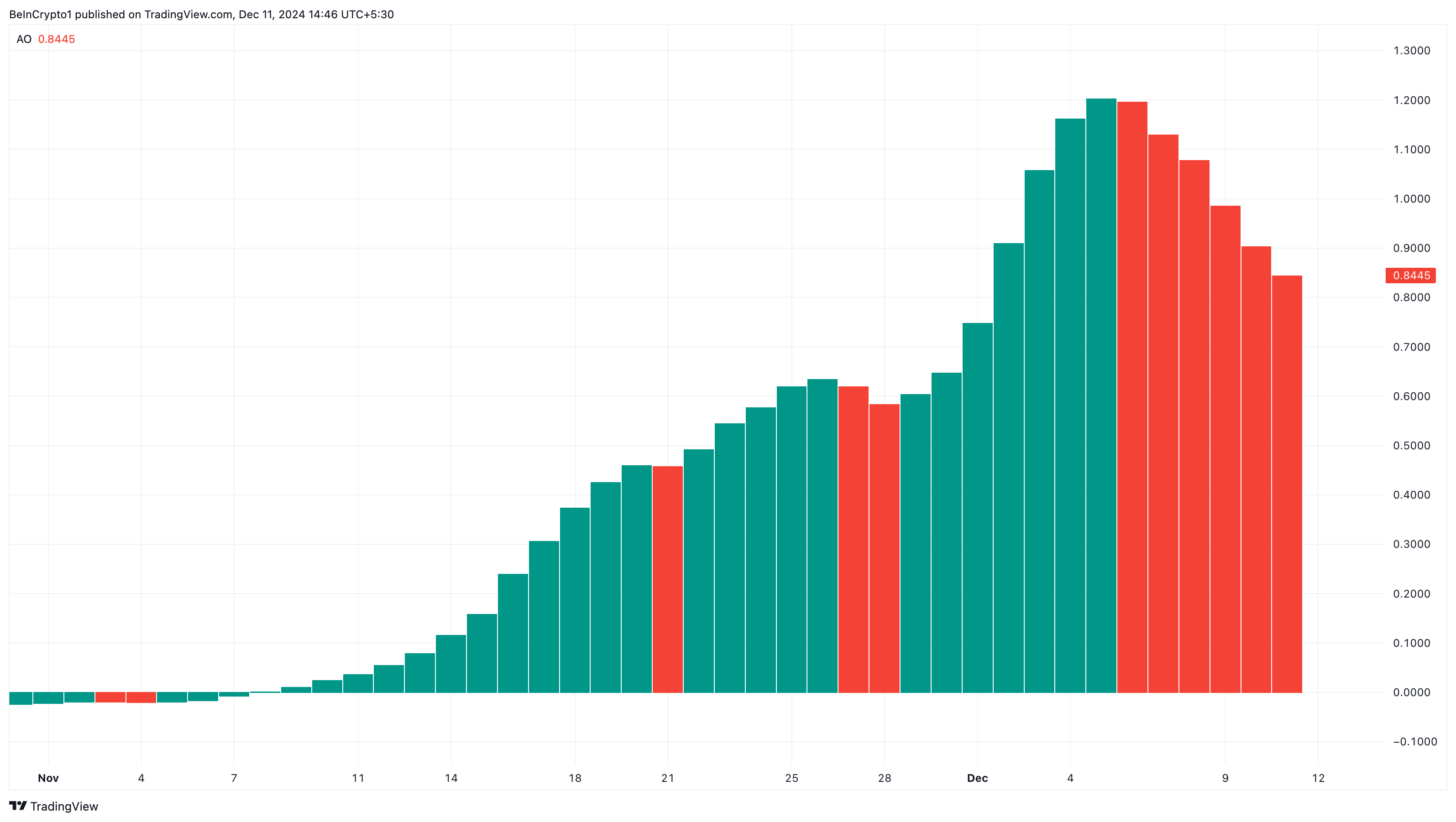 في وقت النشر، AO إيجابي. ومع ذلك، أظهر المؤشر أشرطة هيستوجرام حمراء، مما يشير إلى أن الزخم الصعودي حول العملة البديلة يتلاشى.