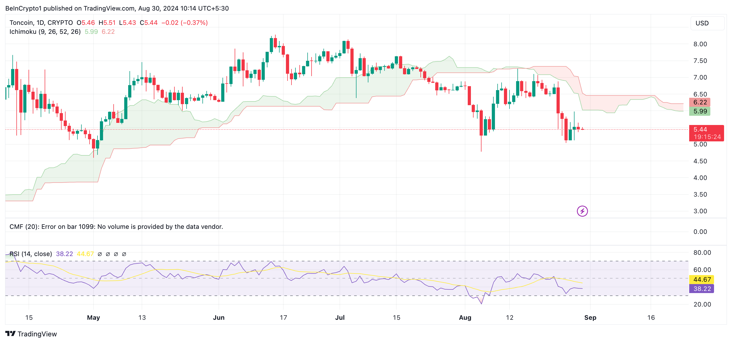 يشير تقييم أداء سعر TON على الرسم البياني ليوم واحد إلى احتمال حدوث مزيد من الانخفاض على المدى القصير. حالياً، يتم تداول العملة البديلة دون المتوسط المتحرك الرائد A والمتوسط المتحرك الرائد B، اللذين يشكلان مؤشر Ichimoku Cloud الخاص بها.