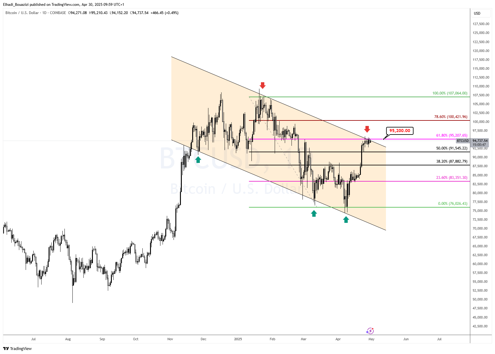 - 95,200 دولار: مقاومة محورية تتقاطع مع الحد العلوي للقناة وتصحيح فيبوناتشي.