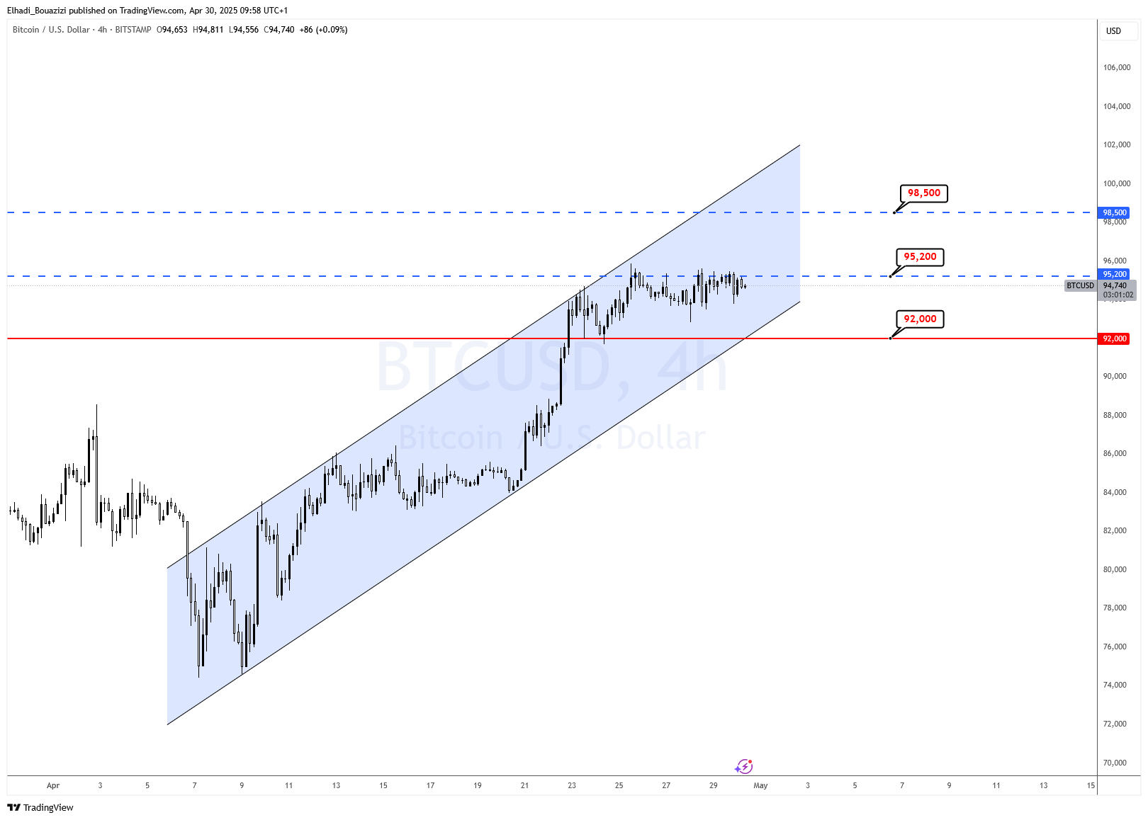 على الرسم البياني 4 ساعات، يتحرك السعر داخل قناة صاعدة منتظمة بدأت منتصف أبريل. وقد نجح في الثبات فوق مستوى 92,000 دولار، والذي يمثل قاعدة القناة ودعمًا ديناميكيًا لاستمرار المسار الصاعد في الأجل القصير.