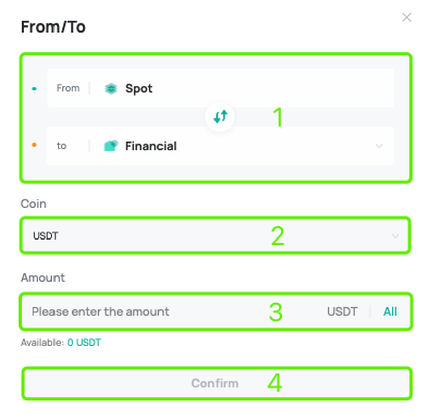 3- تحويل الأموال: حدد USDT، انقر على [نقل]، واختر التحويل من [المحفظة الفورية] إلى [المالية].