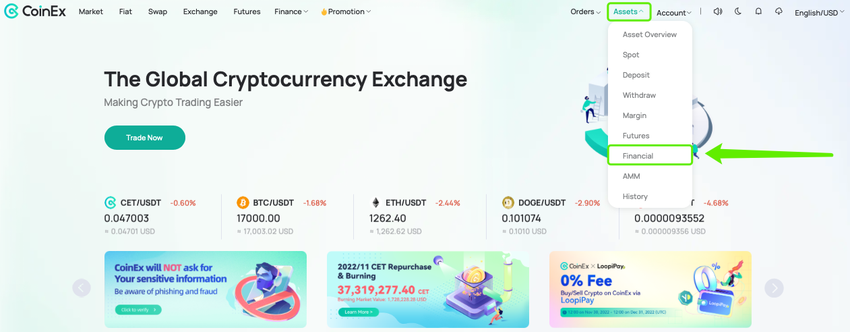 1- تسجيل الدخول إلى CoinEx: قم بزيارة الموقع الرسمي لـ CoinEx، سجل الدخول، وانتقل إلى [المالية] ضمن [الأصول].