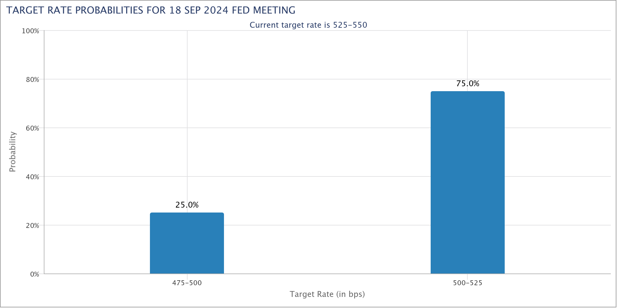 تظهر أداة FedWatch من بورصة شيكاغو لتداول المشتقات فرصة بنسبة 25% لخفض بـ50 نقطة أساس، مما يزيد من تكهنات السوق.