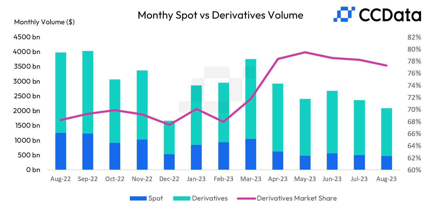 و حسب تقرير صدر عن هذه المنصة المختصة في بيانات الأصول الرقمية المشفرة فإن أنشطة التداول في السوق الفوري تراجعت بنسبة 7.78% لتصل إلى 475 مليار دولار في شهر أغسطس. وهو أدنى حجم مسجل منذ مارس 2019.