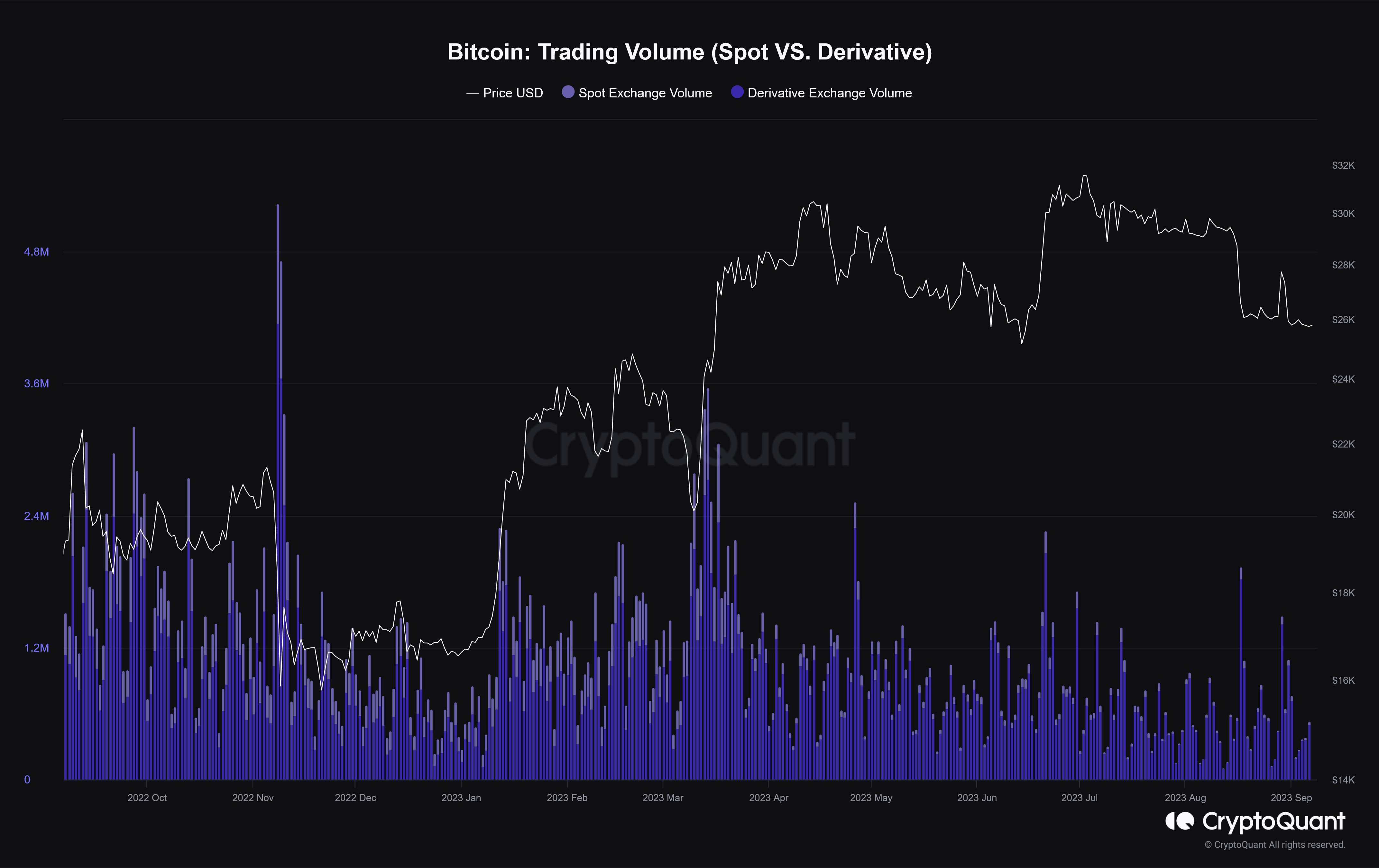 تشير بيانات CryptoQuant إلى انخفاض حجم التداول على بورصات تداول العملات المشفرة الفورية والعقود الآجلة للبتكوين منذ مارس من هذا العام.