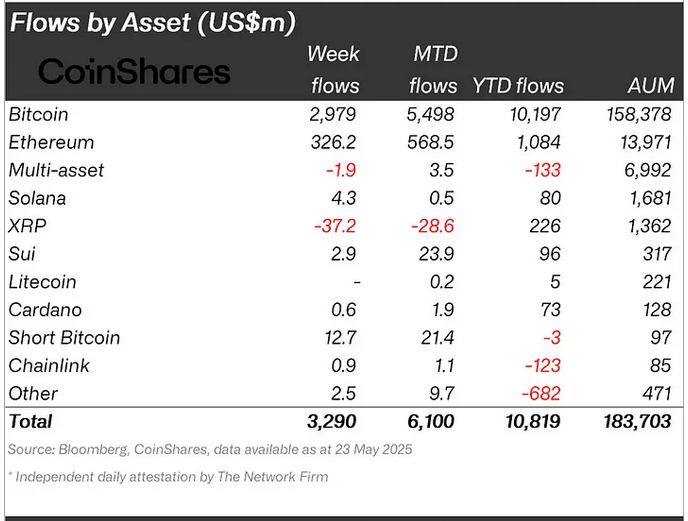 واصلت المنتجات الاستثمارية المرتبطة بسوق العملات الرقمية جذب رؤوس الأموال بوتيرة متسارعة. إذ سجّلت دخول أموال بقيمة 3.3 مليار دولار خلال الأسبوع المنتهي في 24 مايو، بحسب تقرير حديث صادر عن شركة CoinShares. ما رفع إجمالي التدفقات منذ بداية العام إلى 10.8 مليار دولار، في رقم قياسي جديد لعام 2024.