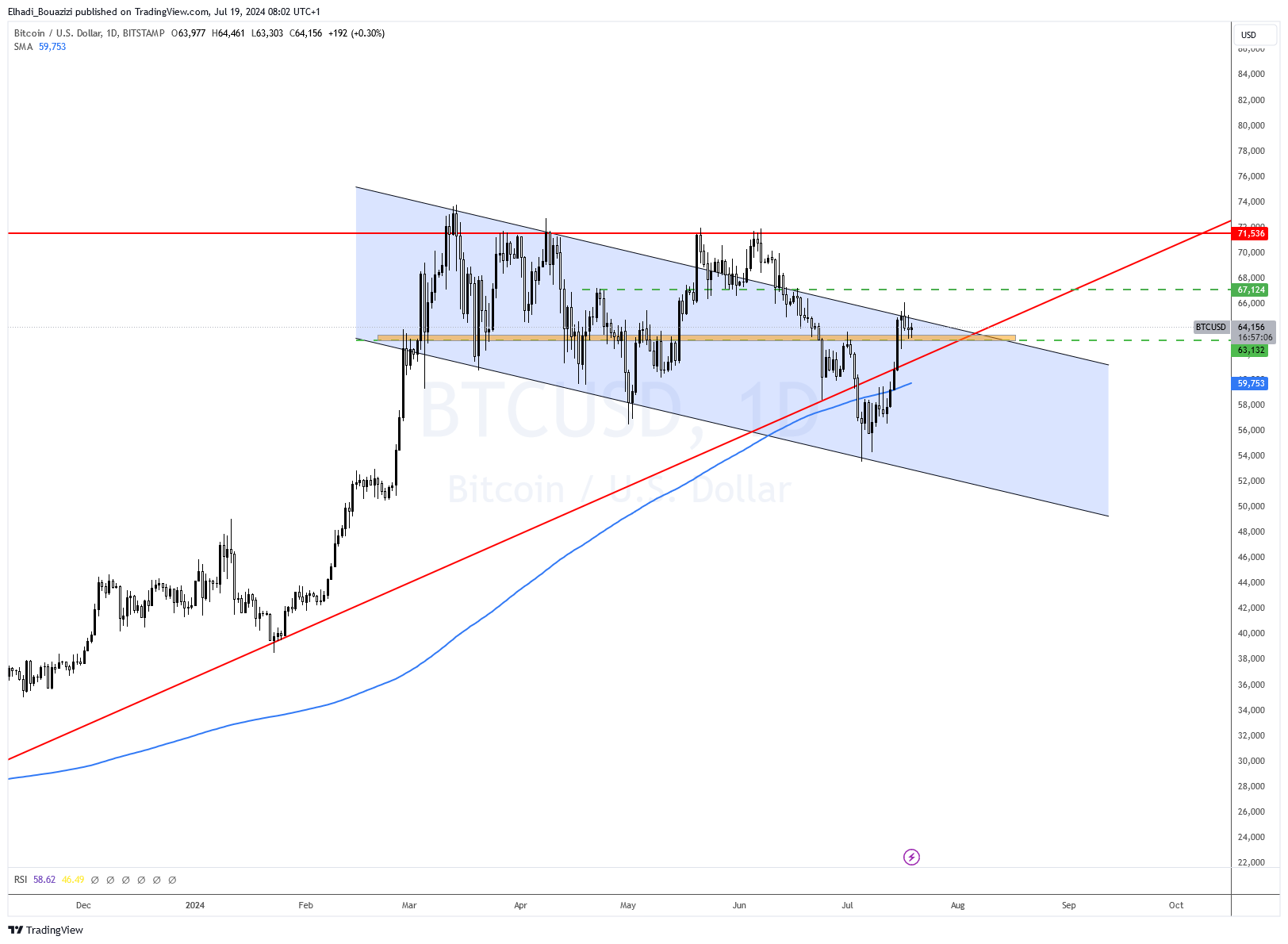 كما نلاحظ في الرسم البياني اليومي، فإن السعر محصور بين الحد العلوي للقناة السعرية الهابطة مع إغلاقات تحت 65,000 دولار. و من الجهة السفلية لدينا مستوى الدعم 63,000 دولار التي يتشكّل من قمم و قيعان سابقة.