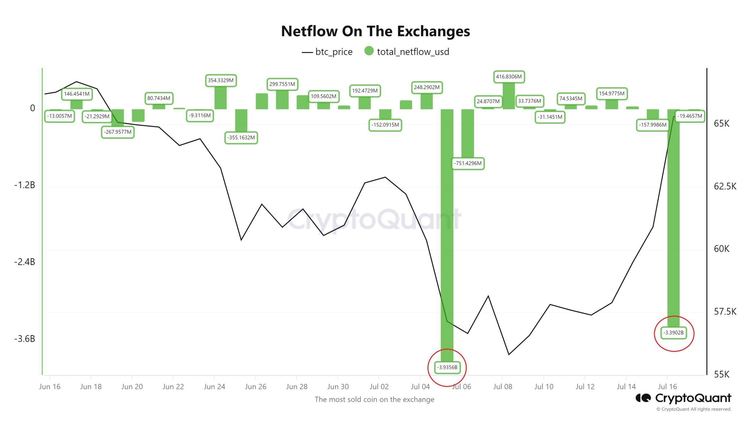 وفي هذا الأسبوع، في 16 يوليو، عاد حاملو البيتكوين إلى المنصات، وسحبوا ما قيمته 3.4 مليار دولار أخرى من البيتكوين. وقد فوجئ البائعون على المكشوف بهذا، على الرغم من أن العملة الرقمية المشفرة الرائدة انخفضت مرة أخرى في 24 ساعة الماضية على خلفية المخاوف المتجددة من مدفوعات بورصة Mt. Gox.