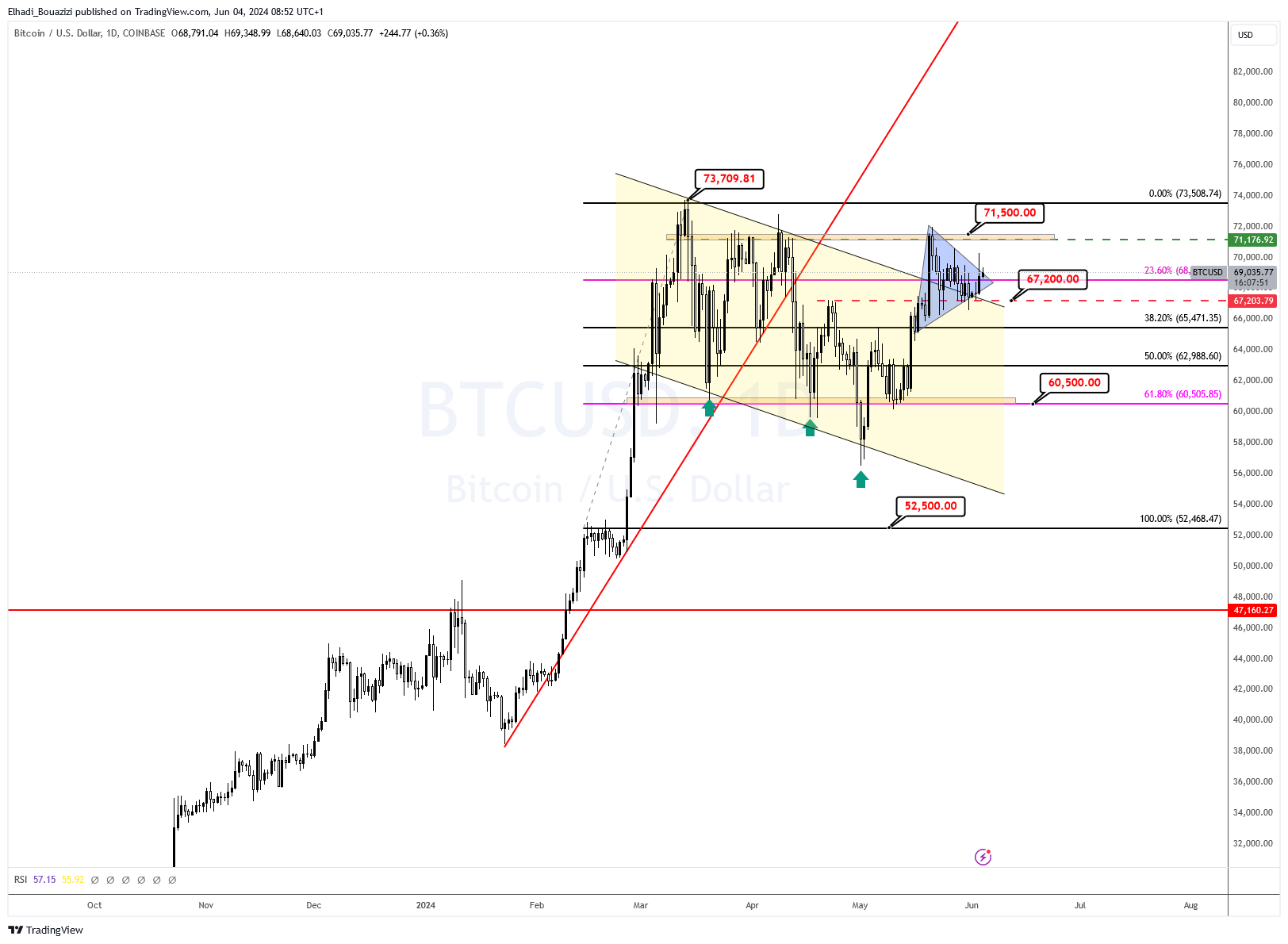 في الاتجاه الهابط، سعر BTC يجد دعم عند مستوى 67,200 دولار و أيضا الحد العلوي للقناة السعرية الهابطة.