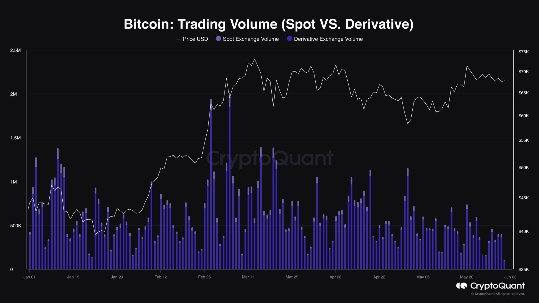 Sponsoredأظهرت بيانات CryptoQuant، وهي منصة تحليلات بيانات البلوكشين، أن حجم تداول البيتكوين انخفض بشكل كبير في الفترة الأخيرة. ويشير حجم التداول إلى إجمالي كمية البيتكوين المتداولة على جميع البورصات المركزية في يوم واحد.