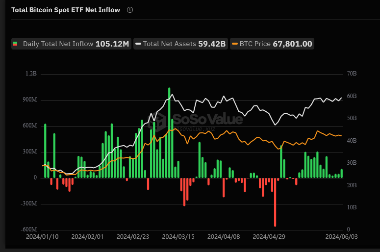 في الوقت نفسه، شهدت صناديق ETF بيتكوين الفوري في الولايات المتحدة تدفقات صافية إيجابية للأسبوع الخامس عشر على التوالي، حيث أضافت 105.12 مليون دولار في يوم واحد. وقد جذبت هذه الصناديق الـ 11 أكثر من 2.28 مليار دولار من التدفقات خلال هذه الفترة، ليصل إجمالي التدفقات الصافية حتى الآن إلى 13.96 مليار دولار.