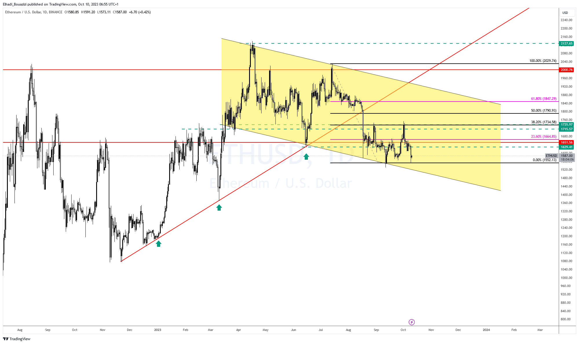 على الرسم البياني اليومي سعر ايثيريوم الآن يتداول عند 1580 دولار أعلى قليلا من أدنى مستوياته في حوالي 8 أشهر.