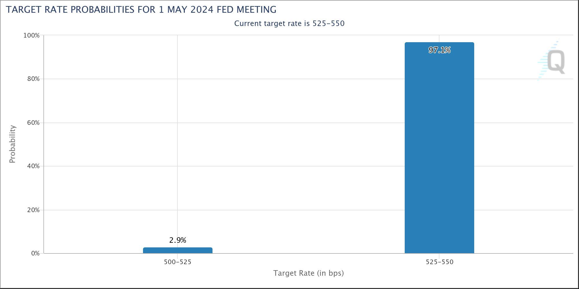 ووفقًا لبيانات مجموعة "سي إم إي" (CME)، هناك احتمال بنسبة 97% أن يحافظ الاحتياطي الفيدرالي على أسعار الفائدة المستهدفة في اجتماع مايو /أيار.