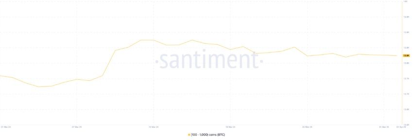 منذ 24 مارس/آذار، ظل عدد المحافظ الرقمية التي تحتوي على ما بين 100 إلى 1000 بيتكوين – والتي غالبًا ما يُشار إليها باسم "الحيتان" - مستقرًا نسبيًا بين 13,872 و13,841.