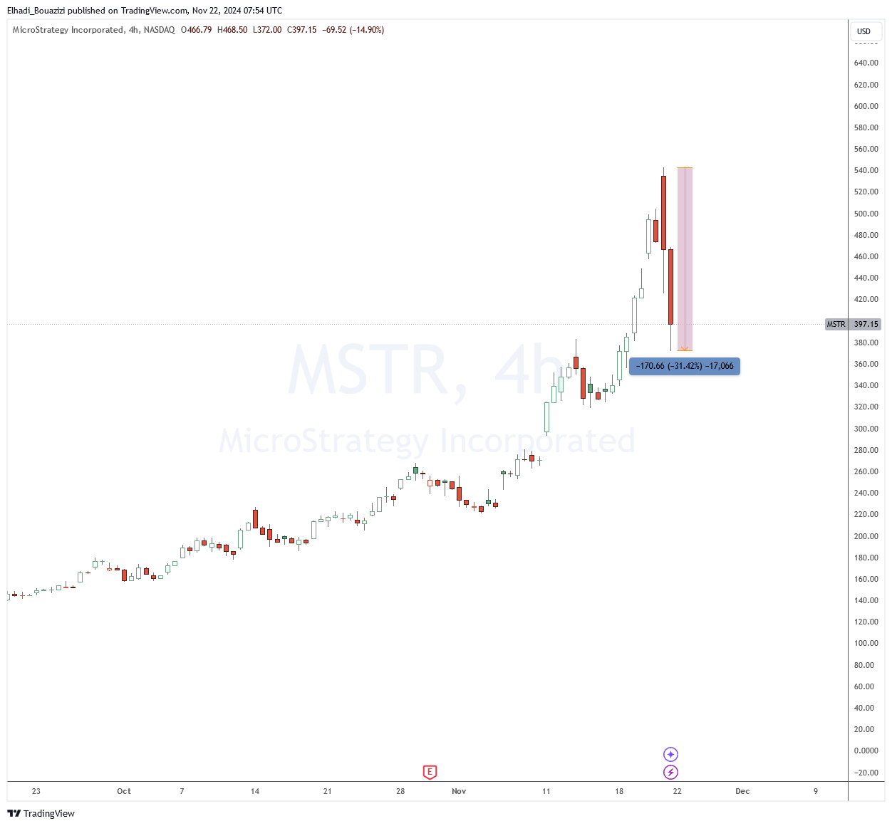 شهدت أسهم شركة مايكروستراتيجي MSTR تراجع حادًا بنسبة فاقت 30% لتصل إلى 372 دولار يوم الخميس، وذلك بعد تصريحات من شركة Citron Research الاستثمارية المؤثرة، حيث كشفت عن اتخاذها صفقة بيع على المكشوف ضد الشركة، بينما حافظت على صفقة شراء طويلة في البيتكوين.