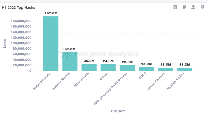من بين أكبر الهجمات كانت الاختراق منصة إقراض العملات الرقمية Euler Finance أين استولى القراصنة على 197 مليون دولار. وأيضا سرقت 67 مليون دولار من محفظة Atomic Wallet، وهجمات MEV sandwich التي أدت إلى خسائر تقدر بما يقرب من 25 مليون دولار.
