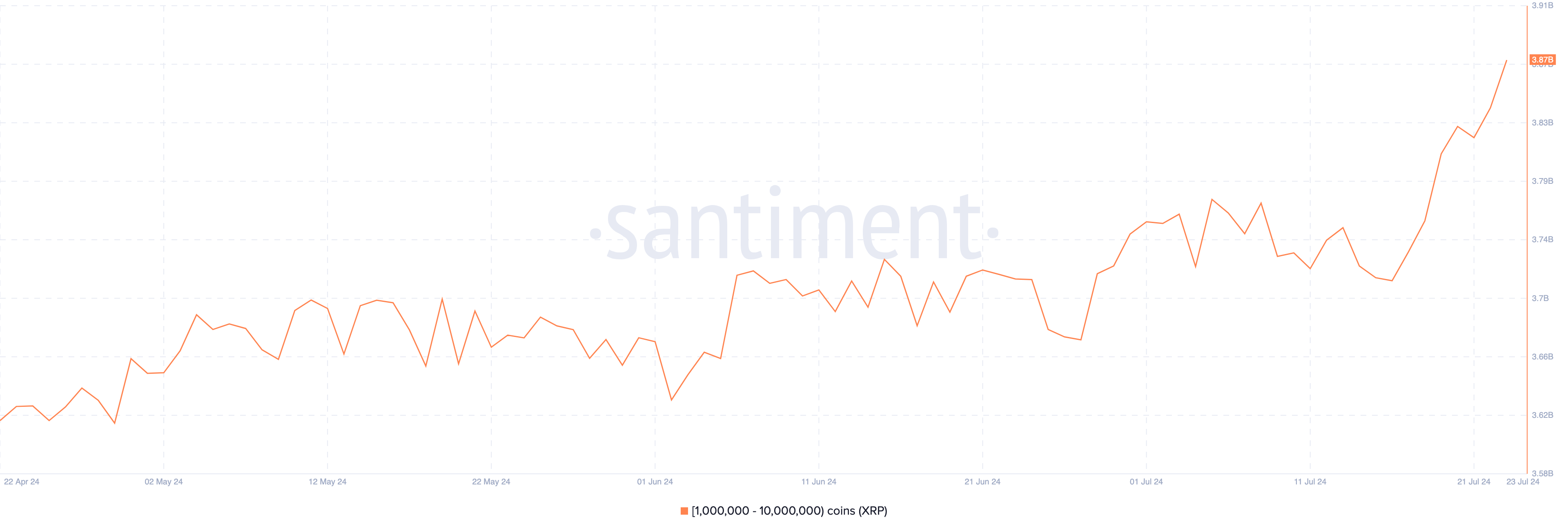 وفقًا لبوابة المعلومات التحليلية على السلسلة، فقد أضاف حاملو XRP الذين يمتلكون بين مليون و 10 ملايين عملة إلى رصيدهم في الأيام السبعة الماضية.