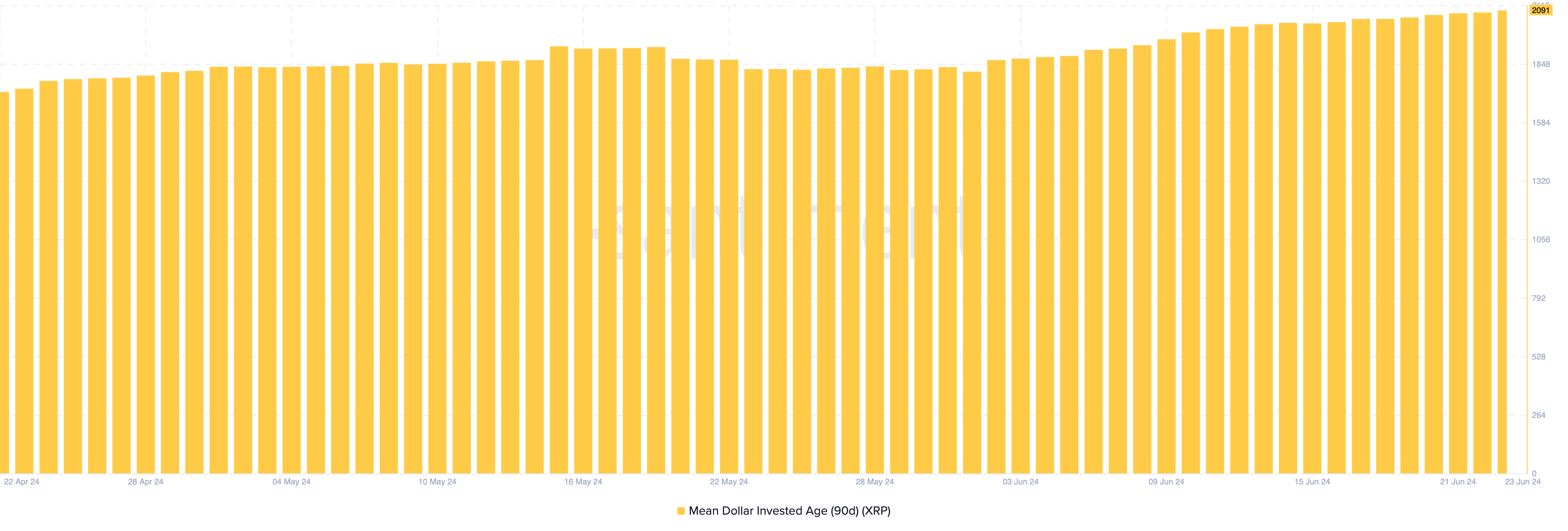 متوسط عمر الدولار المستثمر لـ90 يومًا في XRP. المصدر: Santiment