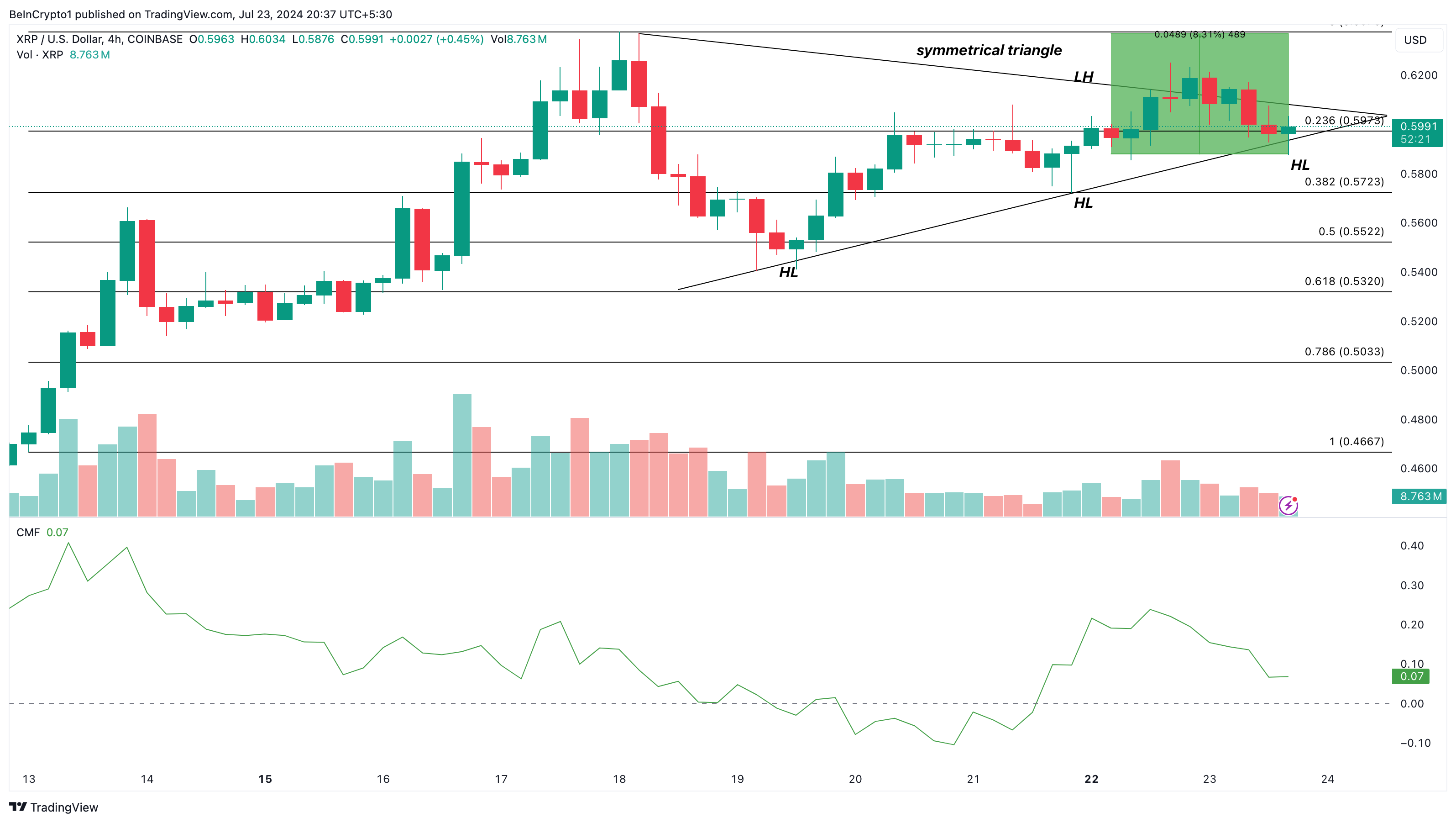 يظهر مخطط XRP/USD لمدة 4 ساعات تشكيل مثلث متماثل. يظهر المثلث المتماثل عندما تربط خطوط اتجاه متقاربة سلسلة من القمم المنخفضة (LH) والقيعان المرتفعة (HL).