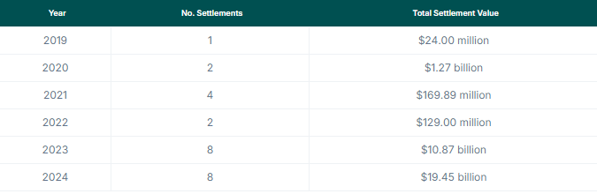 مع استمرار إجراءات تنفيذ القوانين المتعلقة بالعملات المشفرة في الولايات المتحدة، يشير تقرير من CoinGecko إلى أن المنظمين قد جمعوا 19,45 مليار دولار من ثماني تسويات حتى الآن في العام. وهذا يمثل زيادة بنسبة 78,9% في قيمة التسوية مقارنة بعام 2023. مما يضع 2024 في مرتبة أعلى في لوحة القيادة للتسويات القضائية.