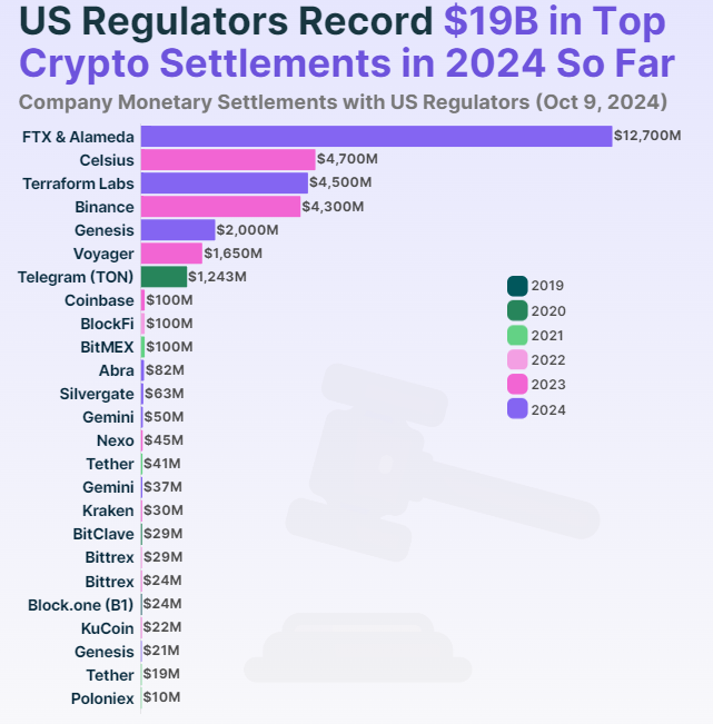 ستة عشر من أصل أفضل 25 تسوية مع الجهات التنظيمية الأمريكية حدثت بين أواخر 2022 و2024. جاء ذلك على خلفية تسارع الرقابة التنظيمية بعد انهيار إمبراطورية العملات المشفرة لسام بانكمان-فريد (SBF)، FTX. لاحظ أن الحادث كشف عن الفساد الذي يمكن أن يوجد داخل الكيانات المتعلقة بالعملات المشفرة. مما دفع إلى تشديد الرقابة التنظيمية لحماية المستثمرين.