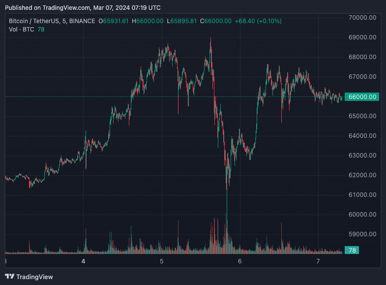 هبطت أكبر عملة مشفرة في العالم تحت مستوى 60 ألف دولار صباح الأمس. لقد حدث تصحيح خاطف، حيث فقد سعر البيتكوين (BTC) حوالي 14٪ من قيمته خلال 4 ساعات فقط. قبل أن ترتد مجددًا نحو الأعلى ووصلت إلى خط 65.7 ألف دولار، وقت كتابة هذا المقال.