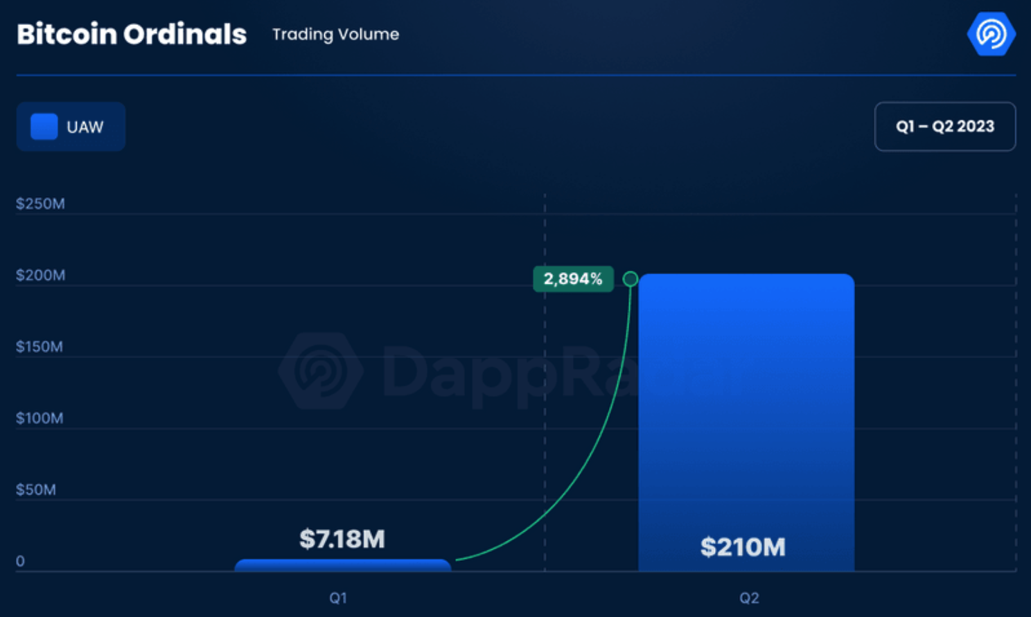 فقد ارتفع حجم التداول في عملات البيتكوين ذات النقوش الترتيبية بنسبة 2834% من الربع الأول لتصل إلى 210 مليون دولار في الربع الثاني، وفقًا لأحدث تقرير أفادت به منصة DappRadar.