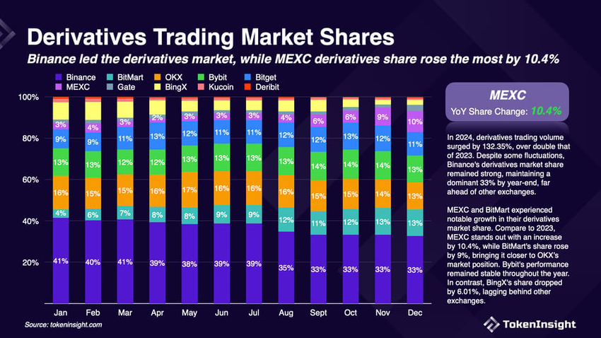 وفي سوق المشتقات المالية، حصة سوق MEXC ارتفعت بنسبة 10.4 نقطة مئوية في عام 2024 مقارنة بعام 2023، وهو ما يمثل أكبر زيادة بين البورصات الكبرى.