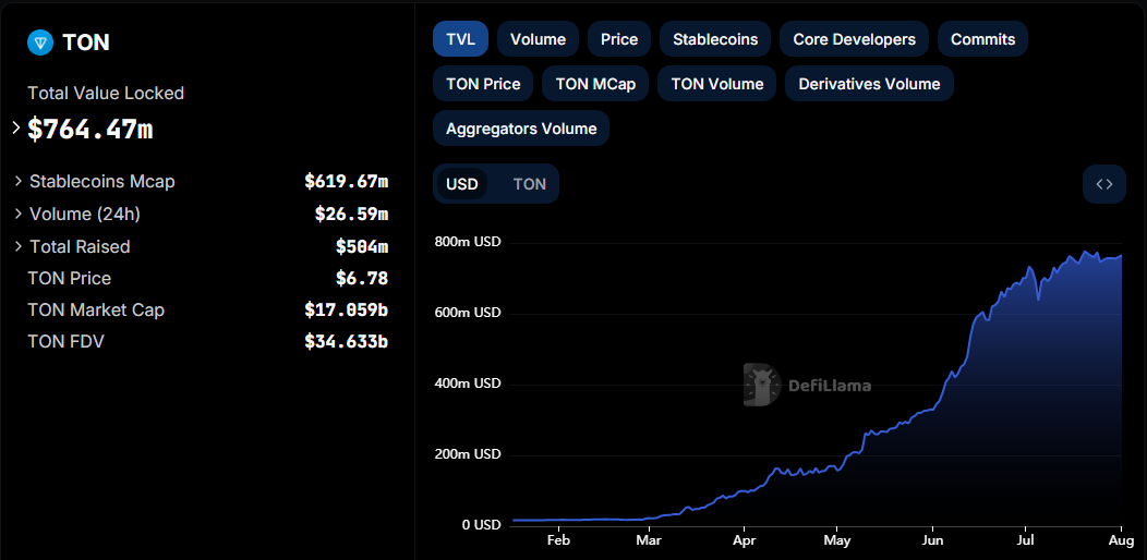 تفسر استراتيجية الشبكة لجذب المستخدمين من خلال دمج الويب 3 المضيف للقيمة نجاحها المستمر. يعكس مقدار رأس المال المستثمر في سلسلة TON نجاحها أيضًا. تظهر بيانات DefiLlama ما يصل إلى 764,47 مليون دولار في القيمة الإجمالية المقفلة (TVL)، بزيادة قدرها 5,558% منذ بداية عام 2024.