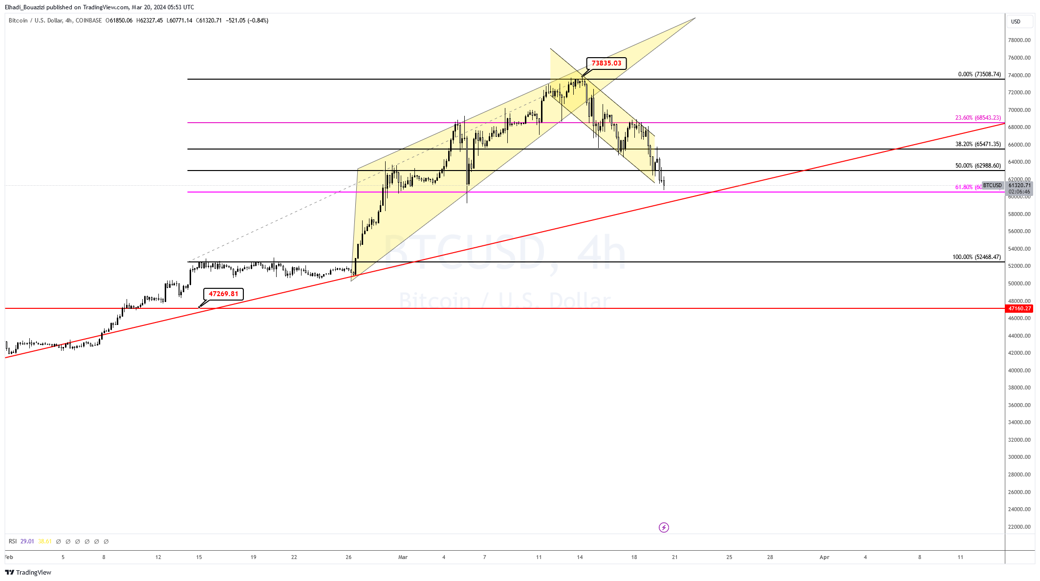 و سعر بيتكوين BTC يقترب من مستوى الدعم الأقوى عند 60,500 دولار مع تصحيح فيبوناتشي 61.8% و خط الاتجاه الصاعد.