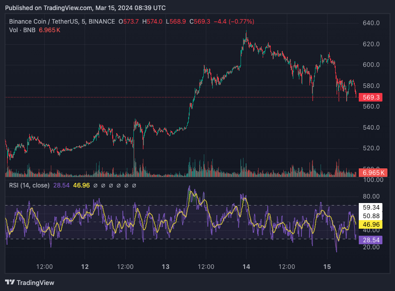 تبلغ قيمة السعر الحالي لعملة بينانس حوالي 579 دولارًا، مع ظهور مؤشرات فنية غير مواتية. مثل مؤشر القوة النسبية الذي انخفض دون الـ 50.